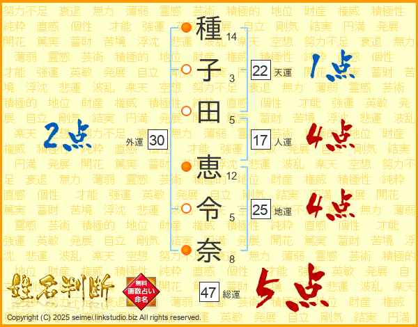 種(14画)子(3画)田(5画) 恵(12画)令(5画)奈(8画)