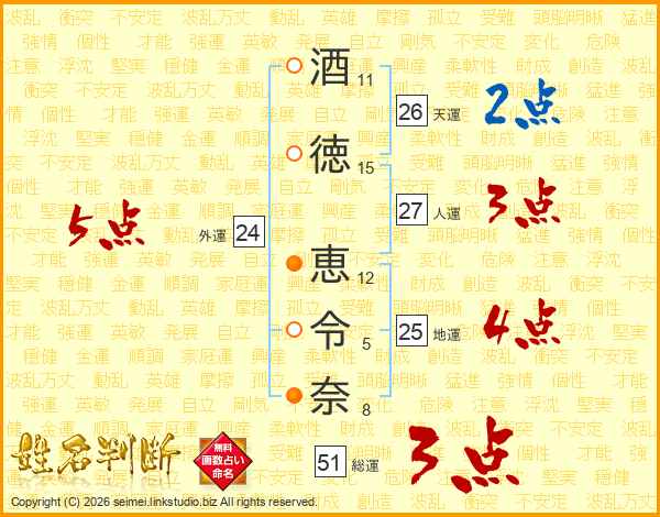 酒(11画)徳(15画) 恵(12画)令(5画)奈(8画)