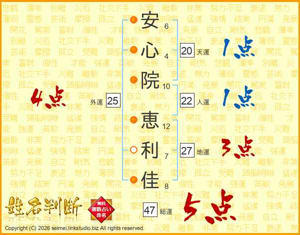 安(6画)心(4画)院(10画) 恵(12画)利(7画)佳(8画)