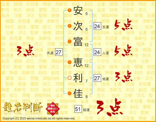 安(6画)次(6画)富(12画) 恵(12画)利(7画)佳(8画)