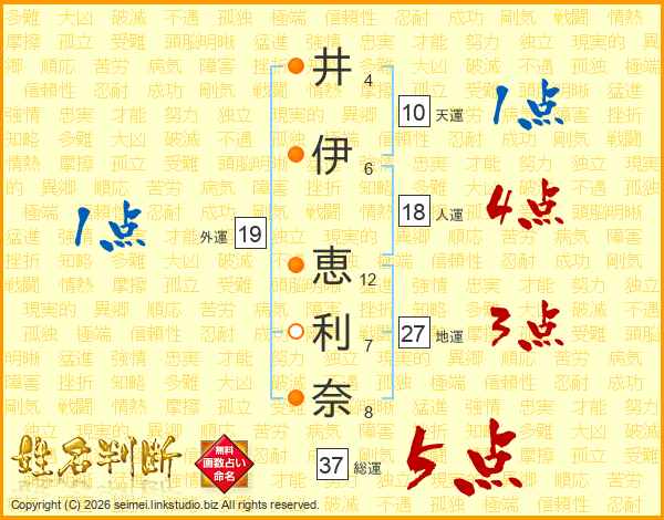 井(4画)伊(6画) 恵(12画)利(7画)奈(8画)