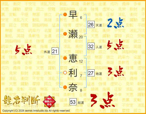 早(6画)瀬(20画) 恵(12画)利(7画)奈(8画)