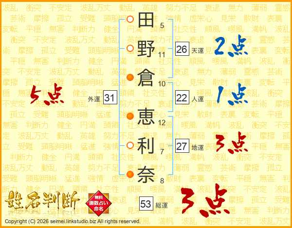 田(5画)野(11画)倉(10画) 恵(12画)利(7画)奈(8画)