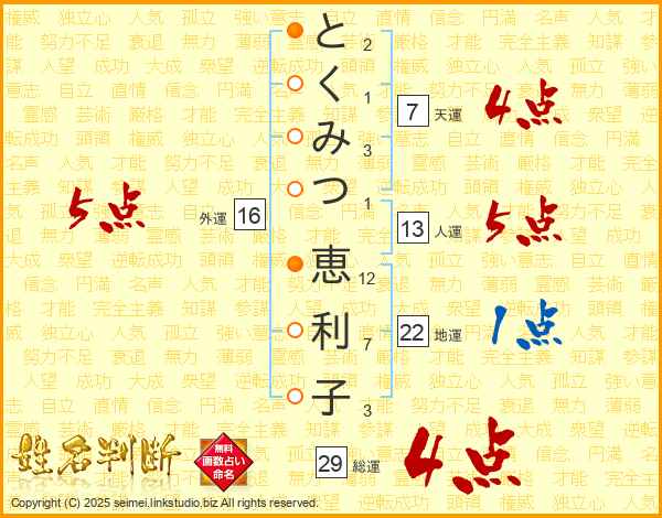 と(2画)く(1画)み(3画)つ(1画) 恵(12画)利(7画)子(3画)