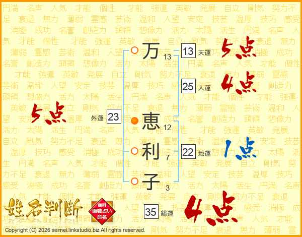 万(13画) 恵(12画)利(7画)子(3画)