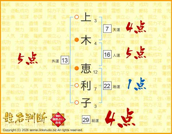 上(3画)木(4画) 恵(12画)利(7画)子(3画)