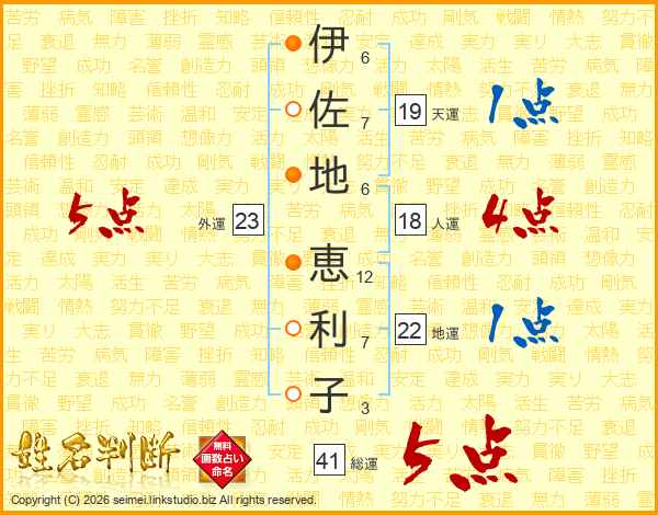 伊(6画)佐(7画)地(6画) 恵(12画)利(7画)子(3画)