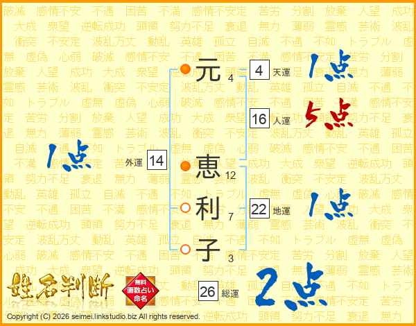 元(4画) 恵(12画)利(7画)子(3画)