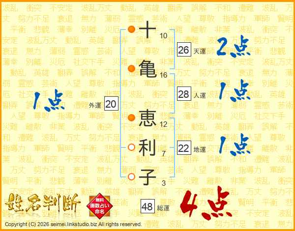 十(10画)亀(16画) 恵(12画)利(7画)子(3画)