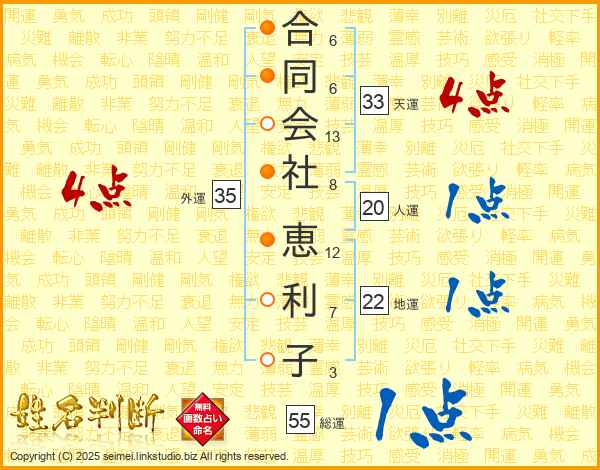 合(6画)同(6画)会(13画)社(8画) 恵(12画)利(7画)子(3画)