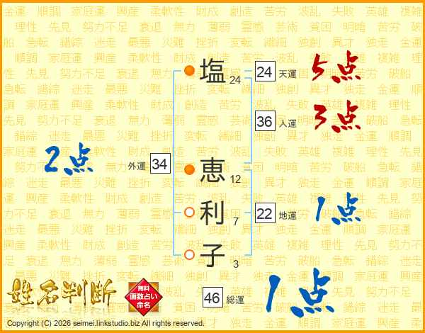 塩(24画) 恵(12画)利(7画)子(3画)