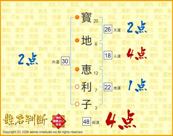 寳(20画)地(6画) 恵(12画)利(7画)子(3画)