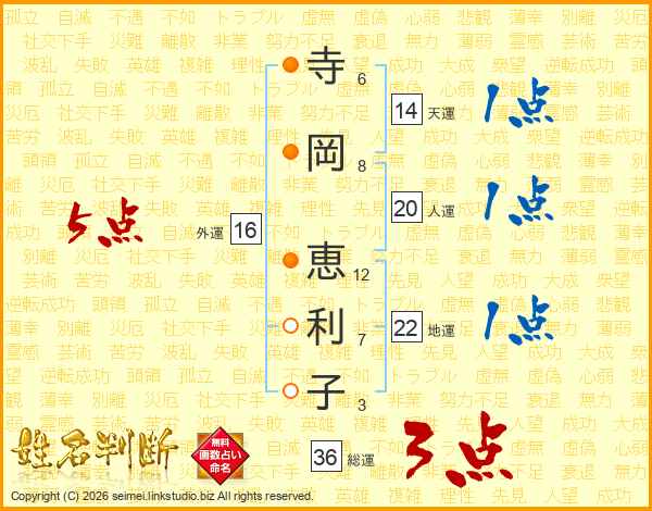 寺(6画)岡(8画) 恵(12画)利(7画)子(3画)