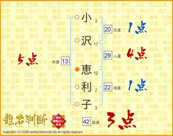 小(3画)沢(17画) 恵(12画)利(7画)子(3画)