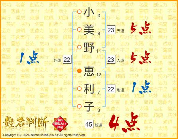 小(3画)美(9画)野(11画) 恵(12画)利(7画)子(3画)