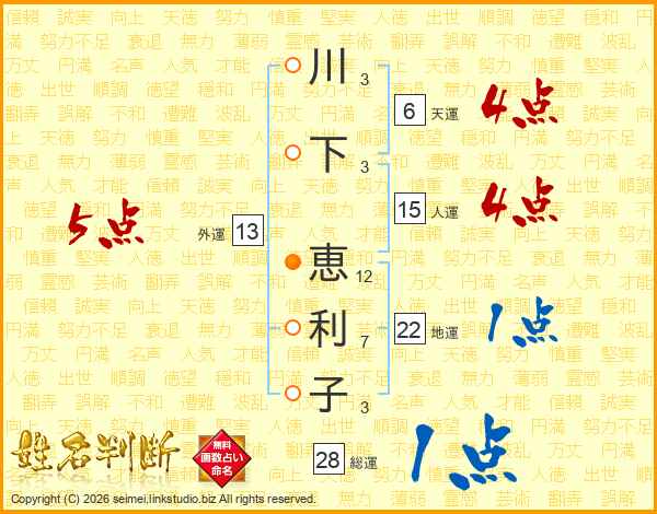 川(3画)下(3画) 恵(12画)利(7画)子(3画)