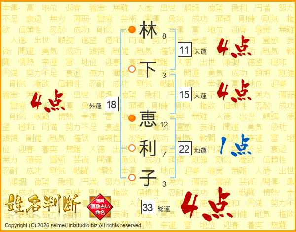 林(8画)下(3画) 恵(12画)利(7画)子(3画)