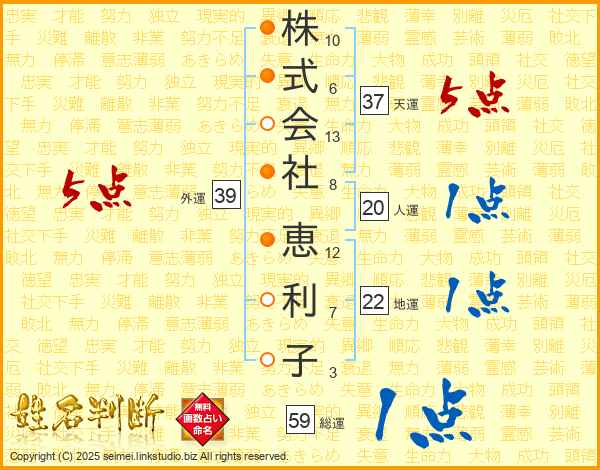 株(10画)式(6画)会(13画)社(8画)  恵(12画)利(7画)子(3画)
