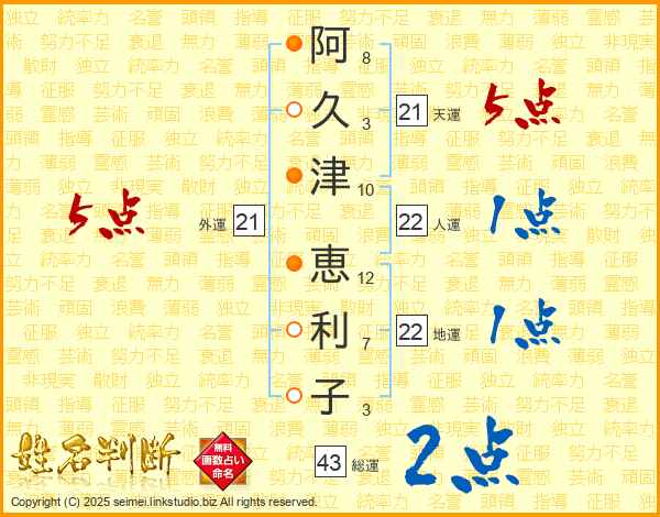 阿(8画)久(3画)津(10画) 恵(12画)利(7画)子(3画)