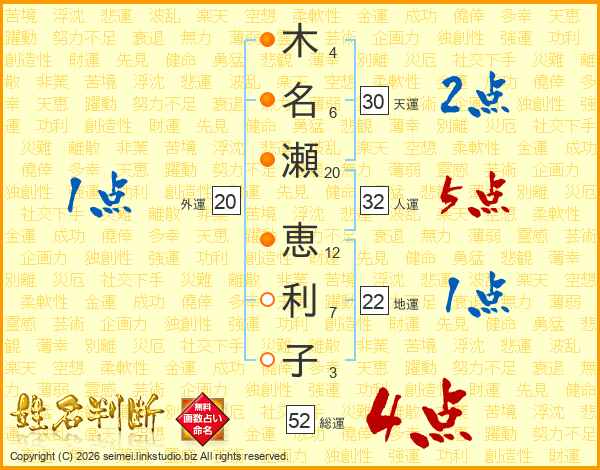 木名瀬恵利子さんの総運は52画の4点!