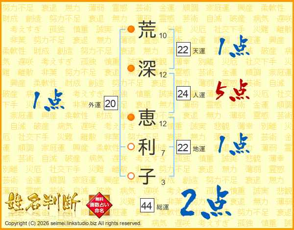 荒(10画)深(12画) 恵(12画)利(7画)子(3画)