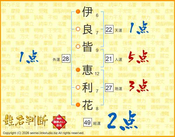伊(6画)良(7画)皆(9画) 恵(12画)利(7画)花(8画)