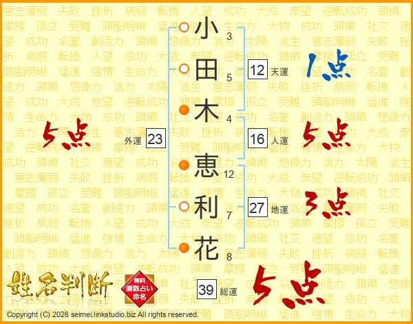 小(3画)田(5画)木(4画) 恵(12画)利(7画)花(8画)