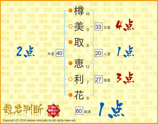 樽(16画)美(9画)取(8画) 恵(12画)利(7画)花(8画)