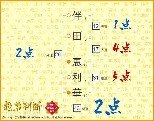 伴(7画)田(5画) 恵(12画)利(7画)華(12画)