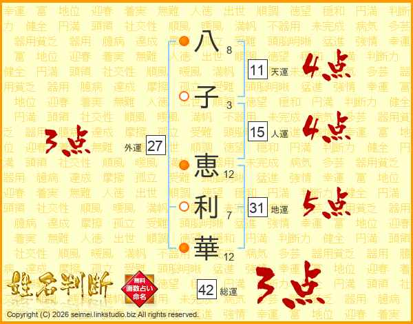 八(8画)子(3画) 恵(12画)利(7画)華(12画)