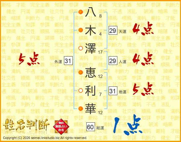 八(8画)木(4画)澤(17画) 恵(12画)利(7画)華(12画)