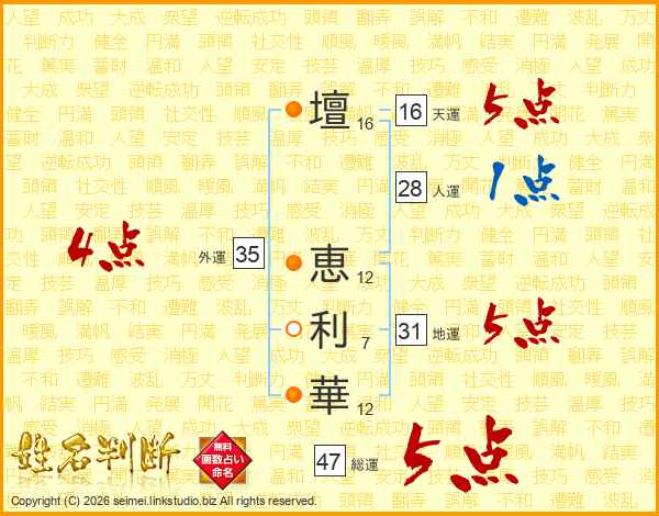 生活面を象徴する運勢です。外部から受ける影響力を表し、結婚運、家庭運や職場、環境への順応性を表します。総運から人運を引いた画数。姓や名が1文字の場合を除く。