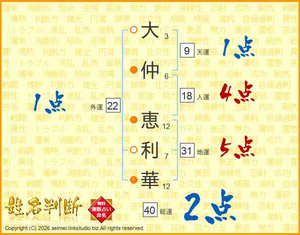 大(3画)仲(6画) 恵(12画)利(7画)華(12画)