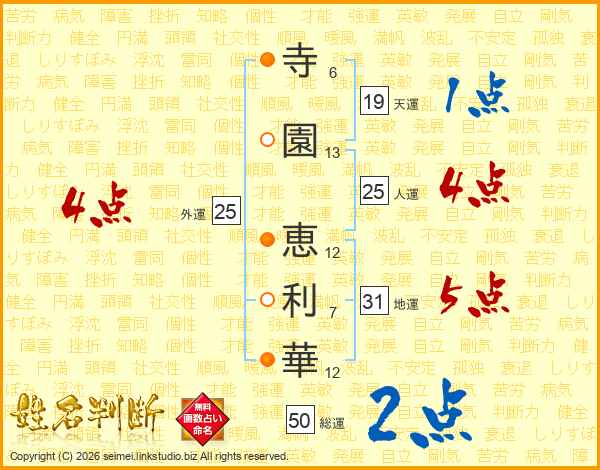 寺(6画)園(13画) 恵(12画)利(7画)華(12画)