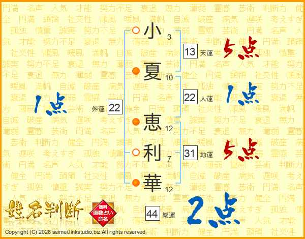 小(3画)夏(10画) 恵(12画)利(7画)華(12画)