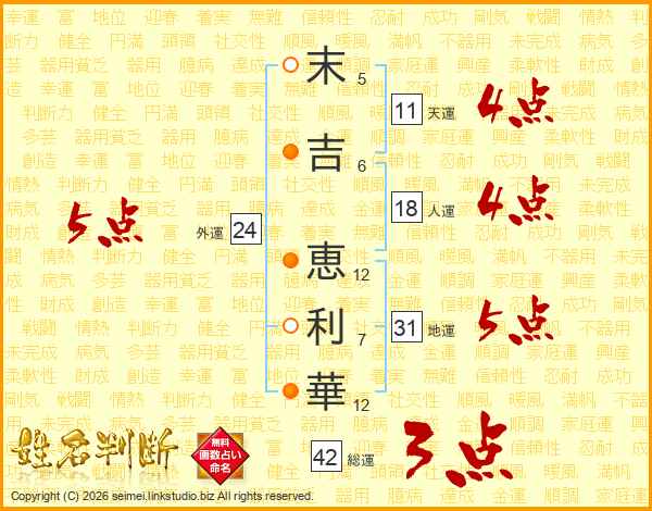 末(5画)吉(6画) 恵(12画)利(7画)華(12画)