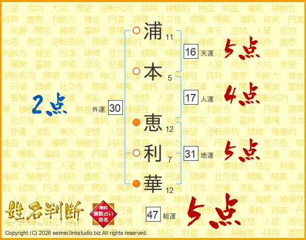 浦本恵利華さんの総運は47画の5点!