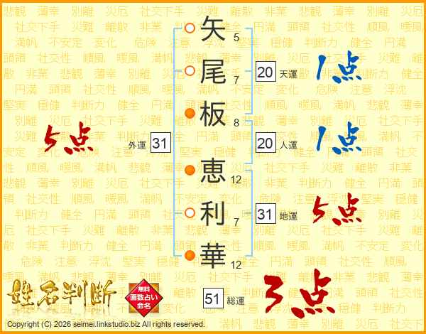 矢(5画)尾(7画)板(8画) 恵(12画)利(7画)華(12画)