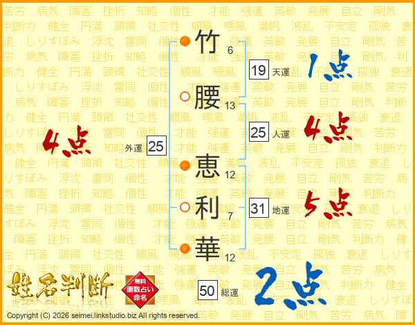 竹(6画)腰(13画) 恵(12画)利(7画)華(12画)