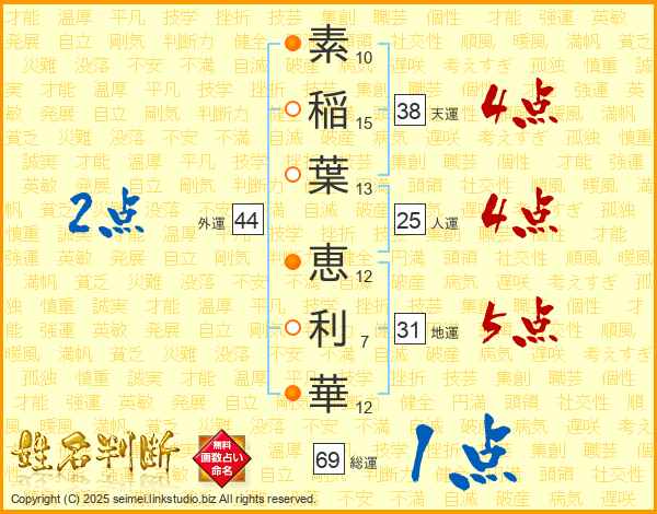 素(10画)稲(15画)葉(13画) 恵(12画)利(7画)華(12画)