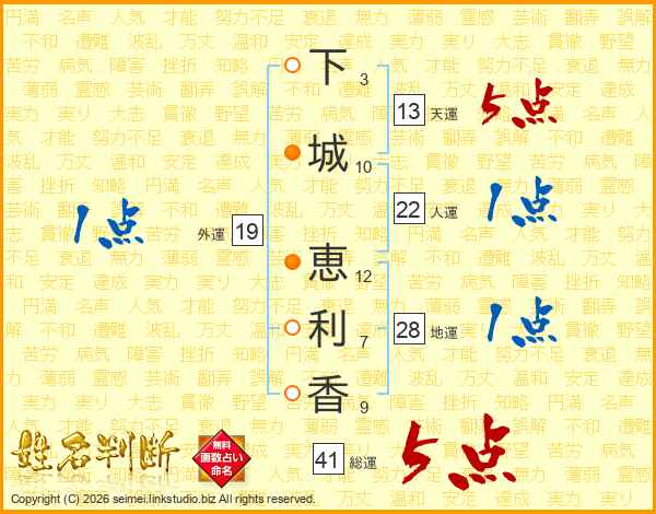 下(3画)城(10画) 恵(12画)利(7画)香(9画)