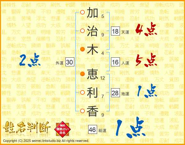 加(5画)治(9画)木(4画) 恵(12画)利(7画)香(9画)