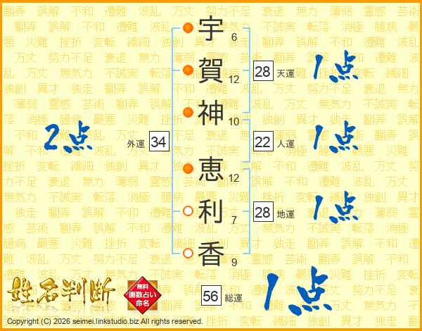 宇(6画)賀(12画)神(10画) 恵(12画)利(7画)香(9画)