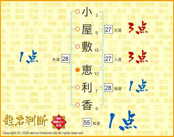 小(3画)屋(9画)敷(15画) 恵(12画)利(7画)香(9画)