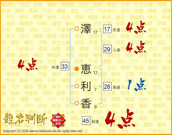 澤(17画) 恵(12画)利(7画)香(9画)