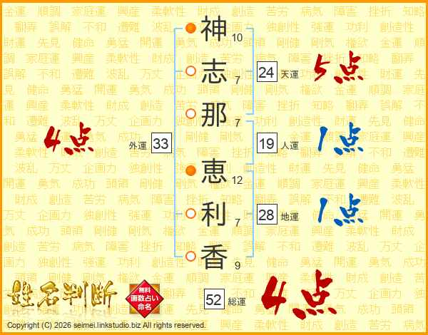 神(10画)志(7画)那(7画) 恵(12画)利(7画)香(9画)