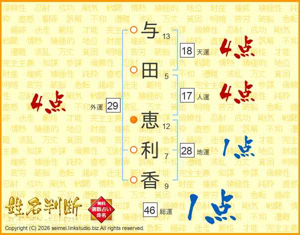 与(13画)田(5画) 恵(12画)利(7画)香(9画)