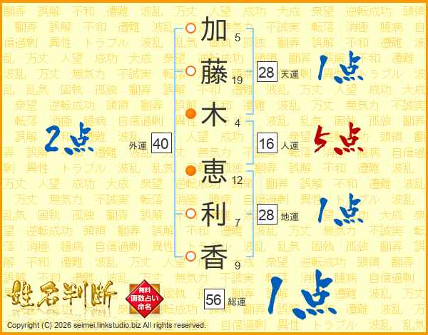 加(5画)藤(19画)木(4画) 恵(12画)利(7画)香(9画)