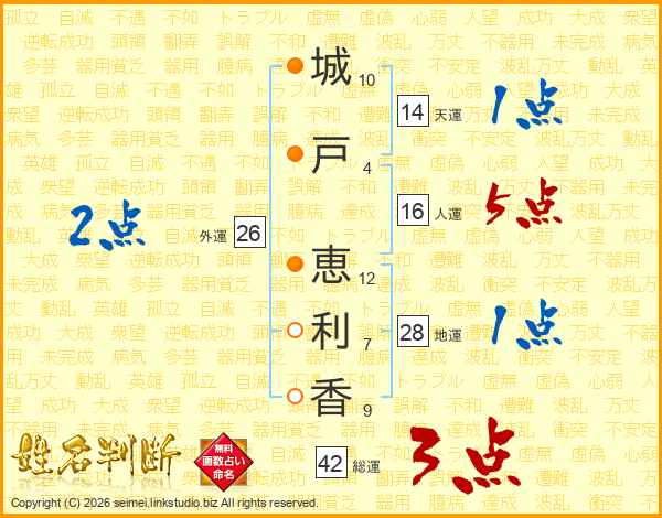 城(10画)戸(4画) 恵(12画)利(7画)香(9画)