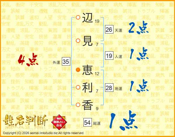 辺(19画)見(7画) 恵(12画)利(7画)香(9画)
